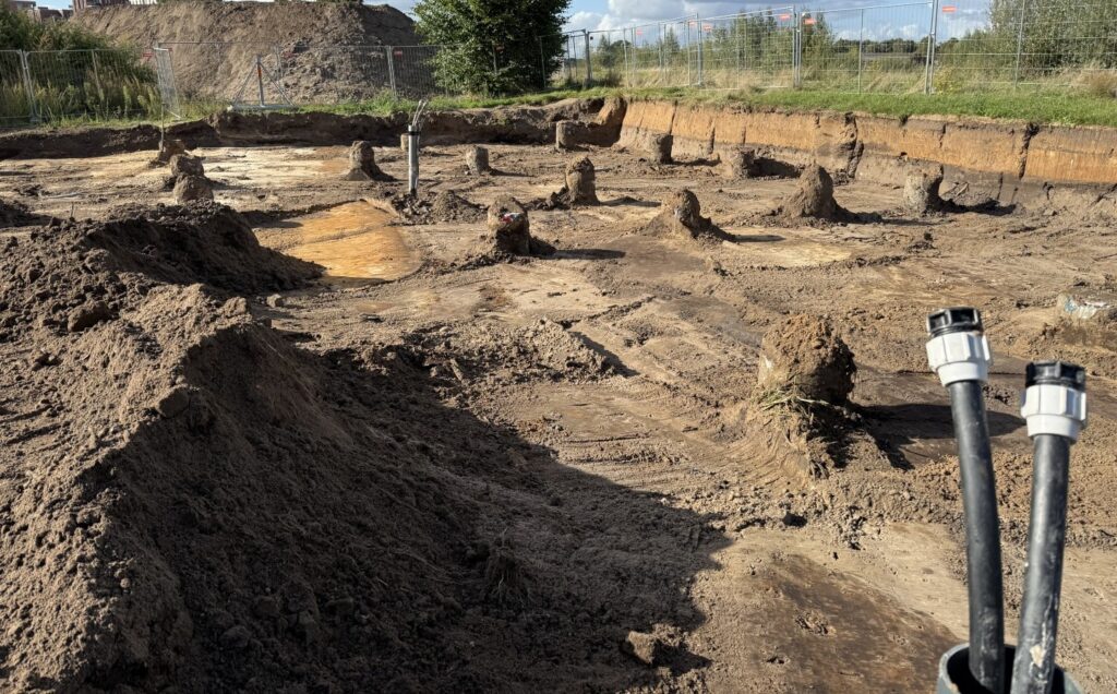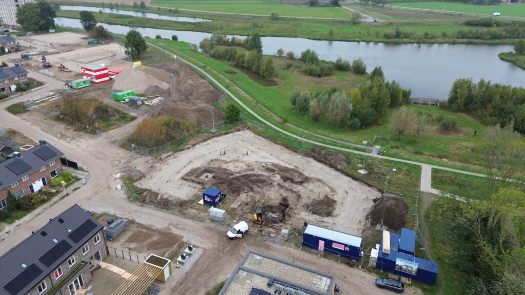 Zo… ligt het bouwterrein er, mei 2025, bij. Schone grondverklaring, omgevingsvergunning, incl. waterschapsvergunning is binnen en de bouwstroom (links op de foto) staat klaar.