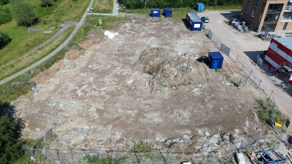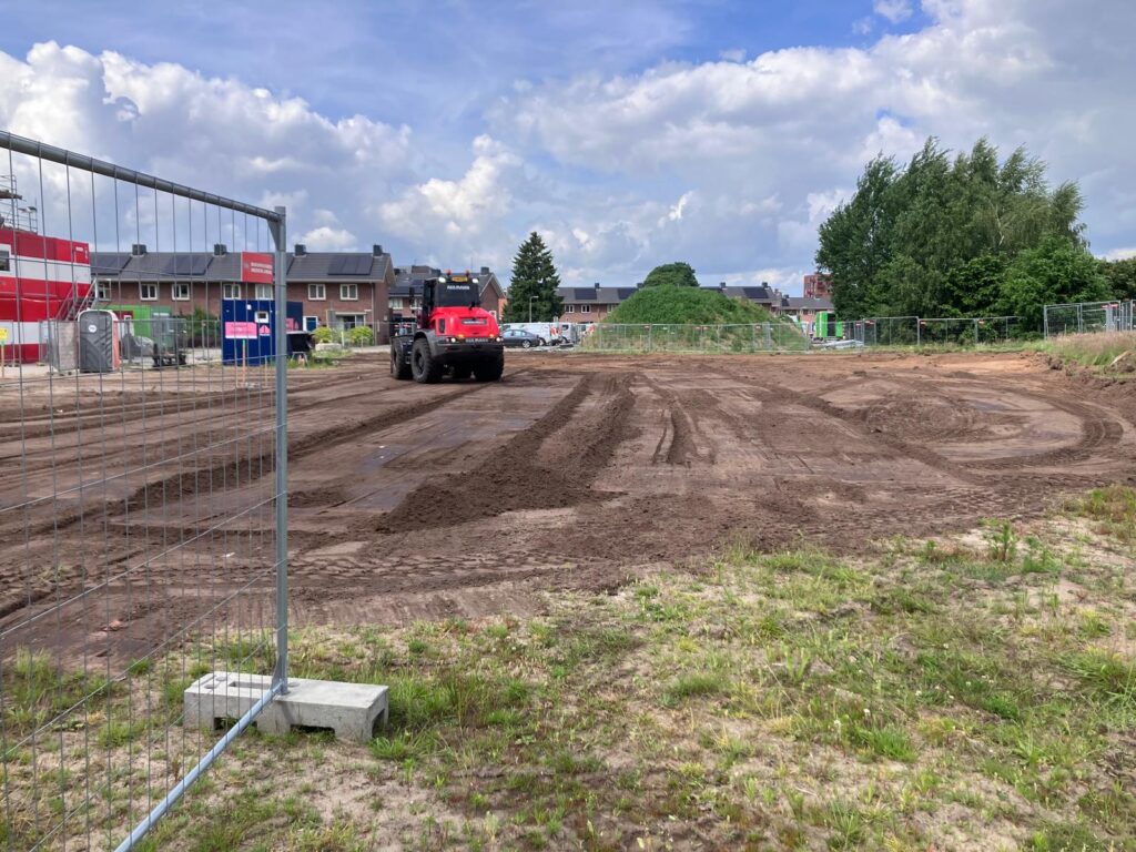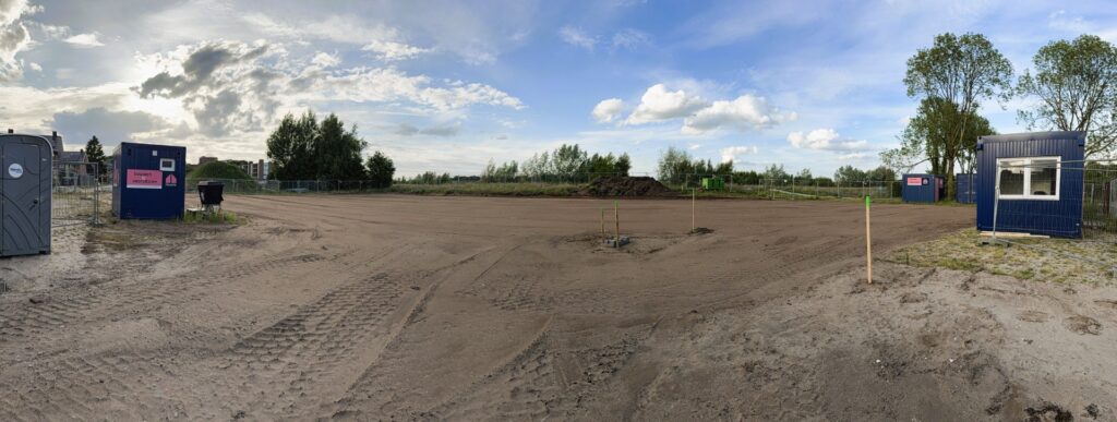 Zo… ligt het bouwterrein er, mei 2025, bij. Schone grondverklaring, omgevingsvergunning, incl. waterschapsvergunning is binnen en de bouwstroom (links op de foto) staat klaar.