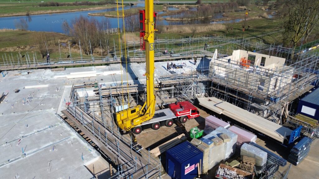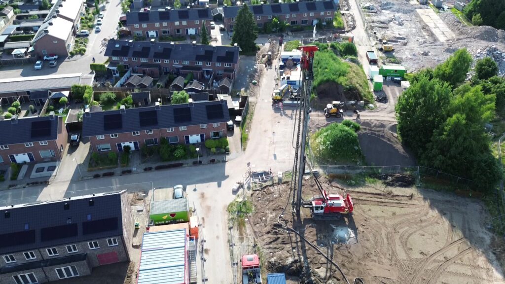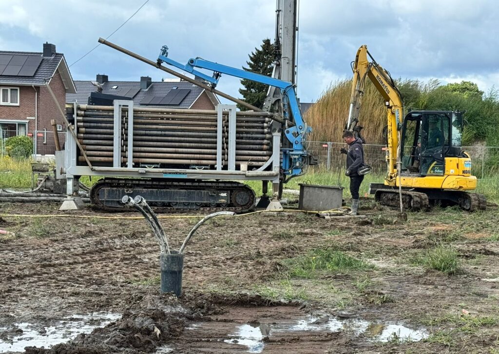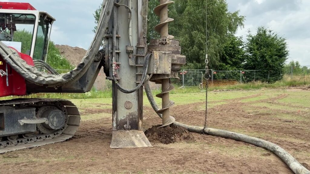 Hieronder: Op maandag 16 juni 2025 werd de eerste schroefmortelpaal geboord. NB deze “heipaal” wordt dus niet geheid, maar ter plaatse in de grond gevormd, waardoor geen hinder voor de omgeving optreedt.