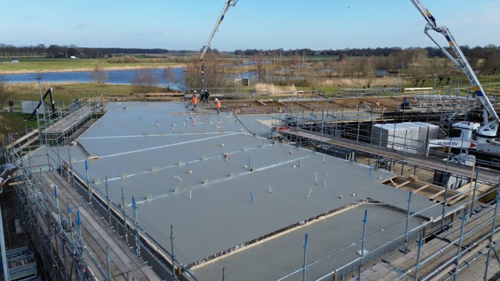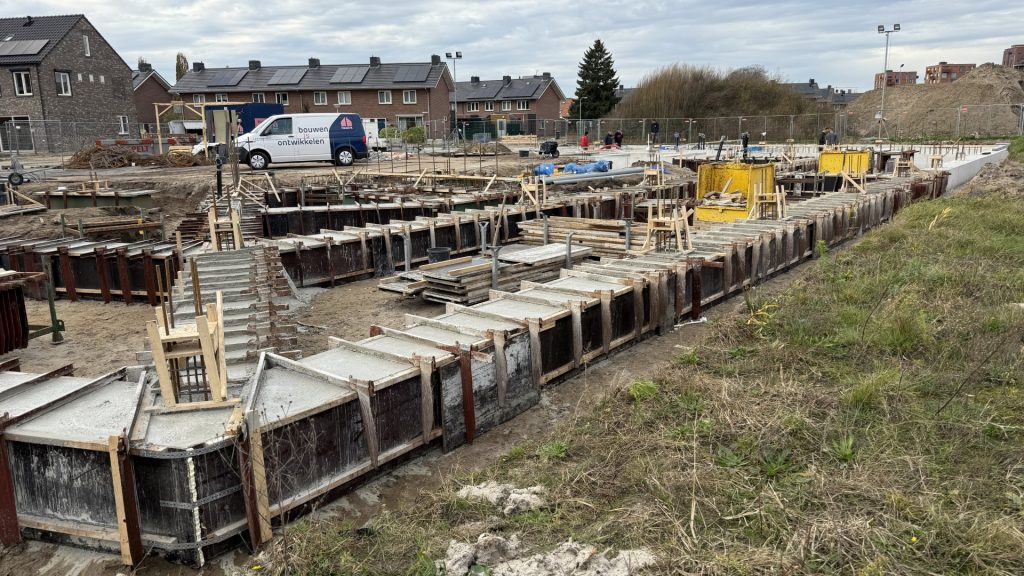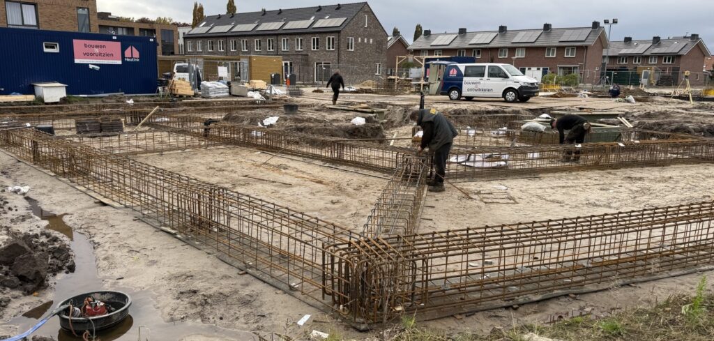 Meestal gaat het bij nieuwbouw om het hoogste punt. Dat komt nog!. Bij ons ligt het diepste punt veel verder van het maaiveld dan het hoogste punt. Waren de boorpalen al doorgedrongen tot 23,65 m onder het maaiveld, inmiddels zijn ook de lussen voor de warmtepompen in de bodem aangelegd. De diepste daarvan bereikt een diepte van maar liefst 135 m onder het maaiveld! Dieper gaan we niet want voor je het weet boren we een vulkaan aan 😉