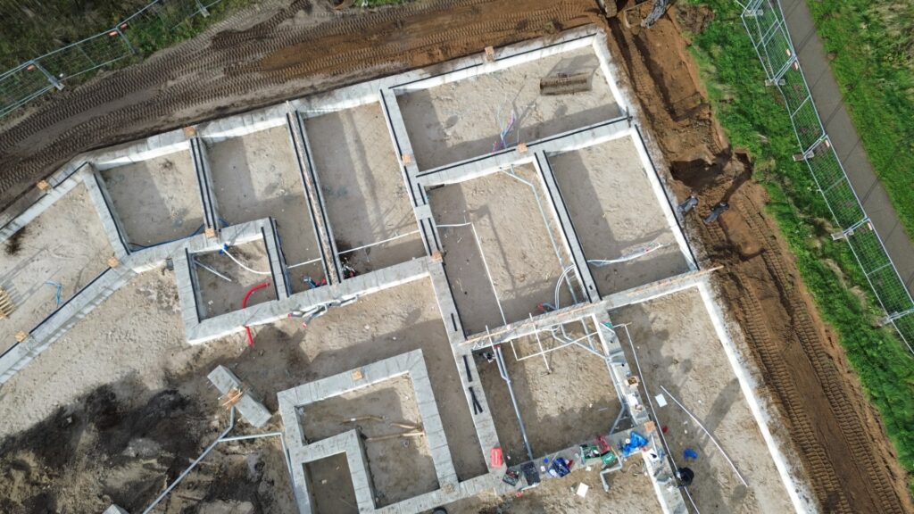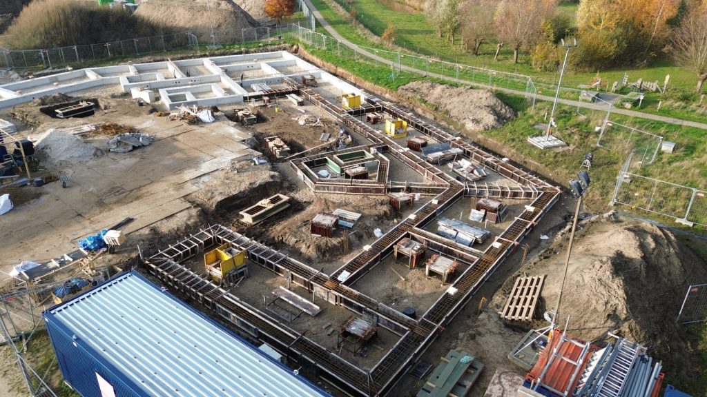 Het grondvlak van het gebouw, klaar voor de horizontale funderingswerkzaamheden.