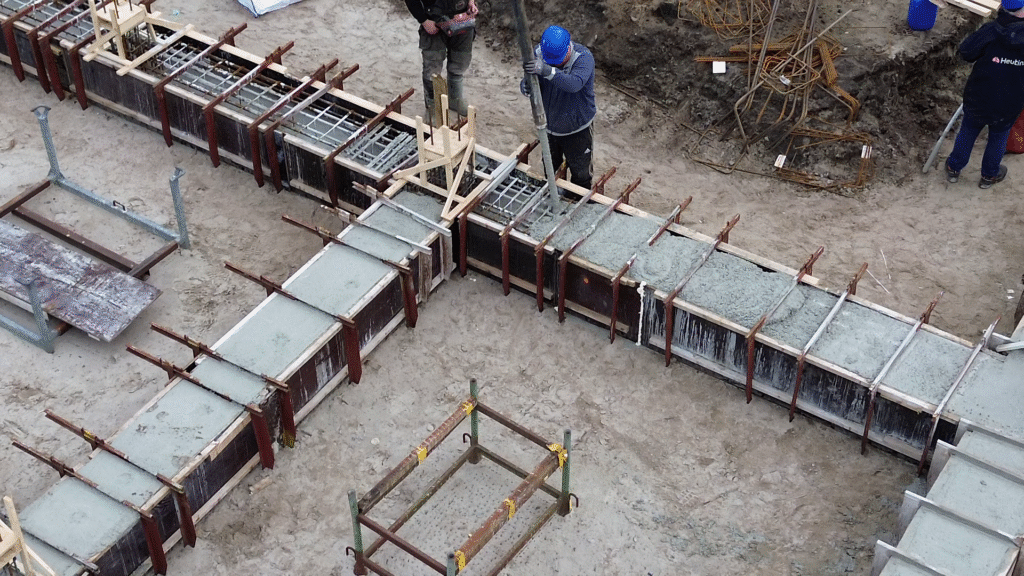 Betonnen funderingen komen (nog) niet uit een fabriek. Men zet ze ter plaatse in elkaar. Een bijzonder secuur werk, waarbij al rekening moet worden gehouden met sparingen voor leidingwerk. Als de bekisting en het vlechtwerk klaar is kan het beton erin.