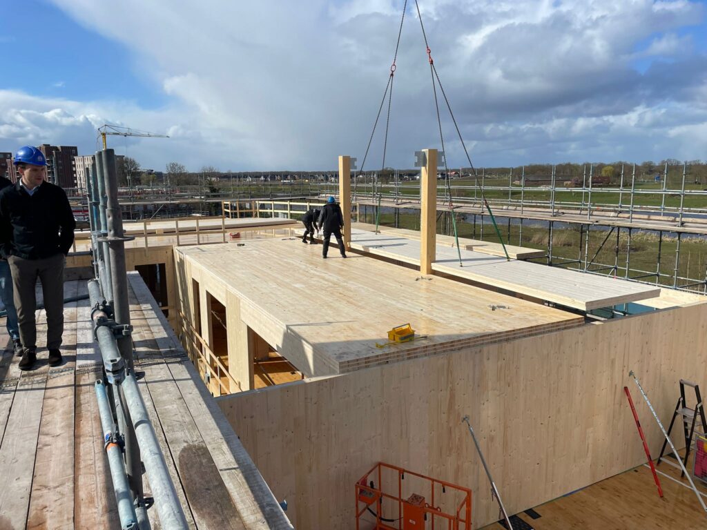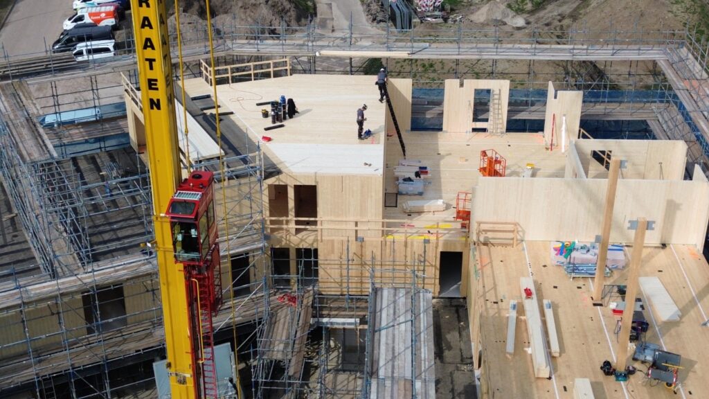 Vanaf de eerste verdiepingsvloer wordt alles opgetrokken in hout (cross laminated timber CLT oftewel kruislaaghout). Daarmee slaan we een grote voorraad CO2 op in ons gebouw!